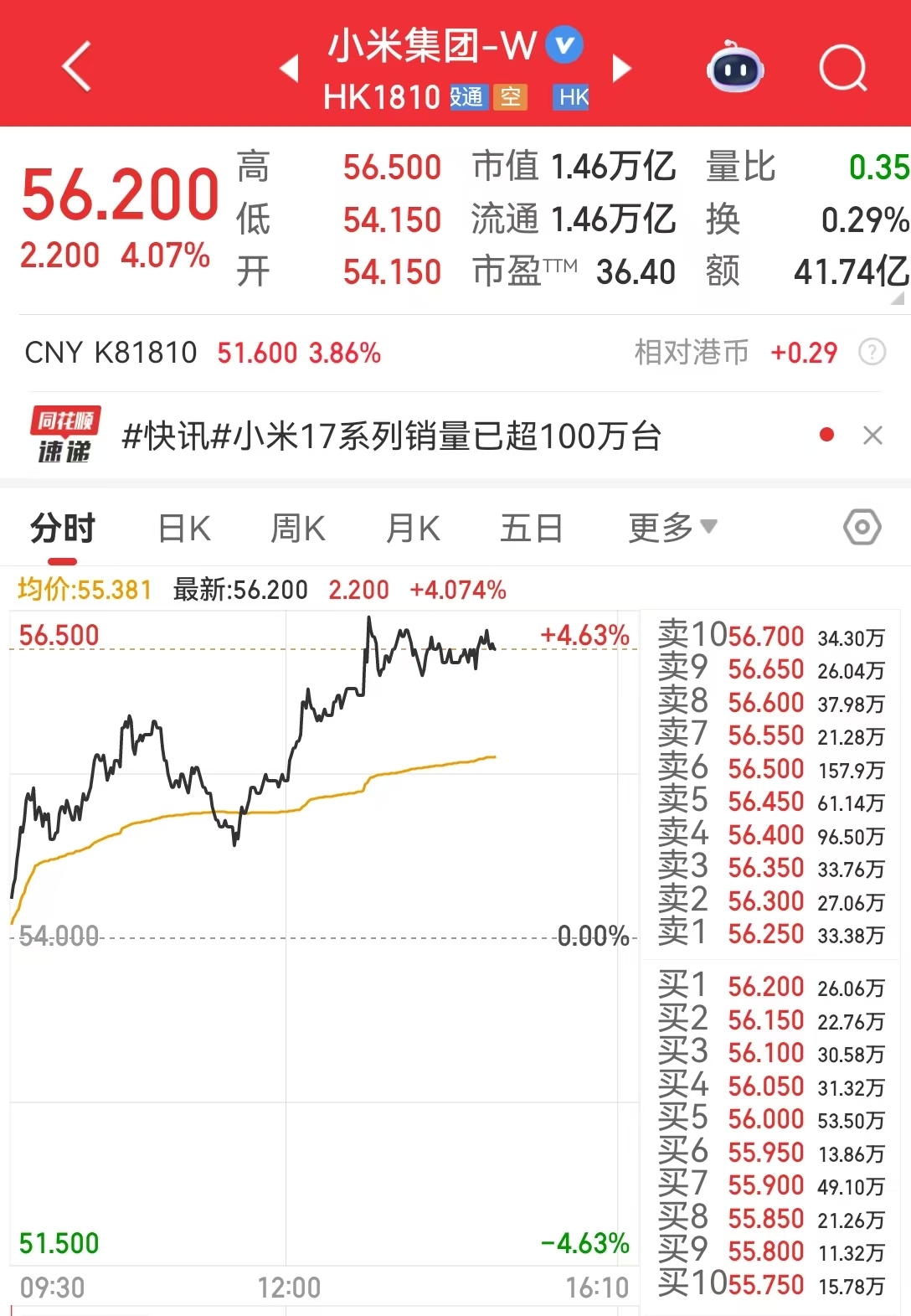 截至10月2日發(fā)稿,小米集團(HK1810)漲幅為4.07%,報56.2港元,最新市值1.46萬億港元。