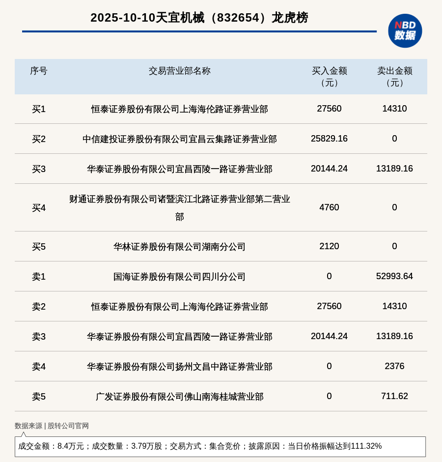 每經(jīng)訊,2025年10月10日,新三板創(chuàng)新層公司天宜機(jī)械(832654,收盤價(jià):2.38元)登上龍虎榜,交易方式是集合競價(jià),披露原因是當(dāng)日價(jià)格振幅達(dá)到111.32%,成交數(shù)量3.79萬股,成交金額8.4萬元。買一席位為恒泰證券股份有限公司上海海倫路證券營業(yè)部,買入2.76萬元;賣一席位為國海證券股份有限公司四川分公司,賣出5.3萬元。