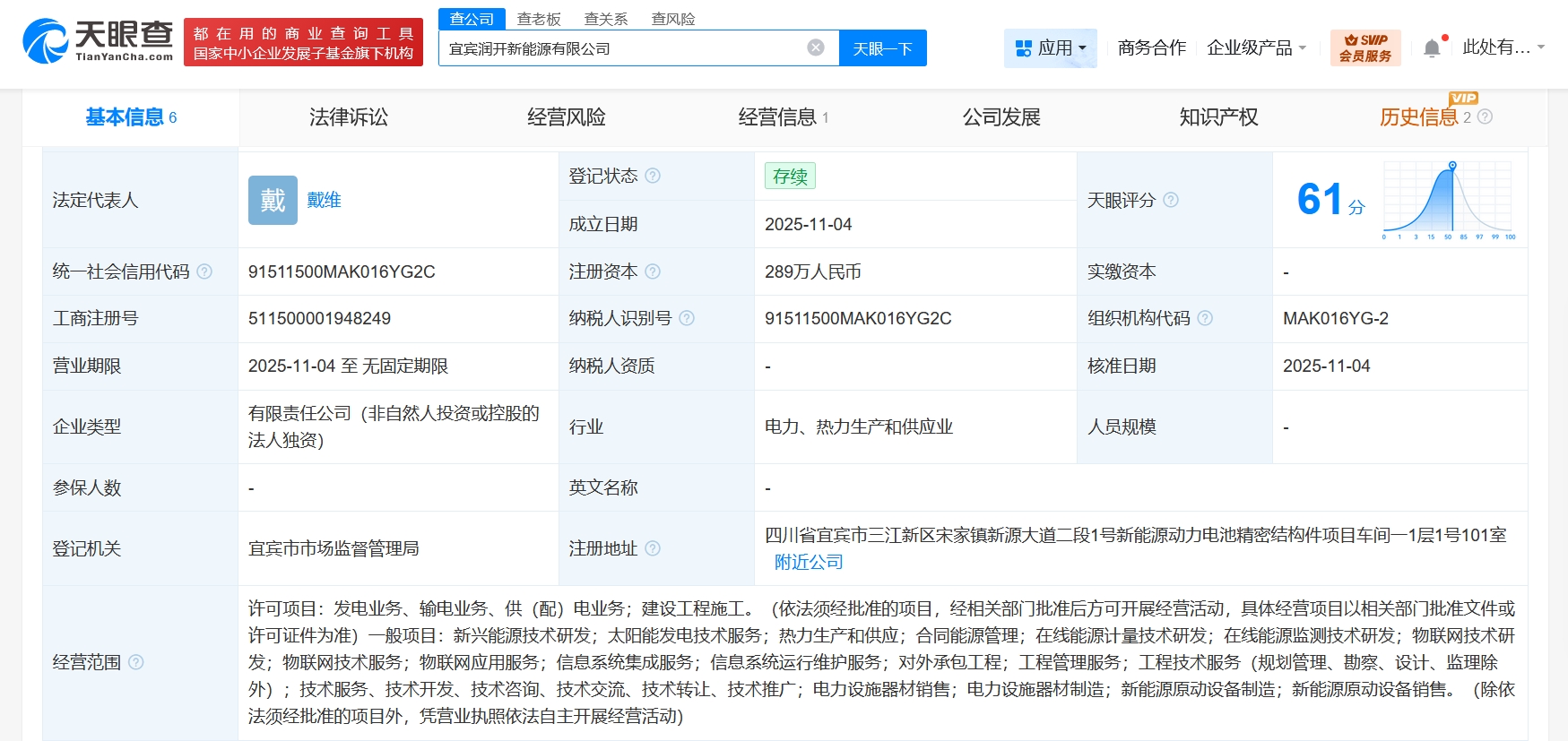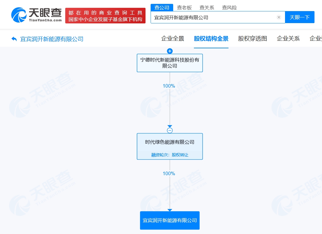 每經(jīng)AI快訊,天眼查工商信息顯示,近日,宜賓潤開新能源有限公司成立,法定代表人為戴維,注冊資本289萬元人民幣,經(jīng)營范圍含發(fā)電業(yè)務、輸電業(yè)務、供(配)電業(yè)務,建設工程施工,新興能源技術研發(fā),太陽能發(fā)電技術服務,熱力生產(chǎn)和供應,合同能源管理,在線能源計量技術研發(fā),信息系統(tǒng)集成服務等。股權全景穿透圖顯示,該公司由時代綠色能源有限公司全資持股,后者為寧德時代(300750)全資子公司。