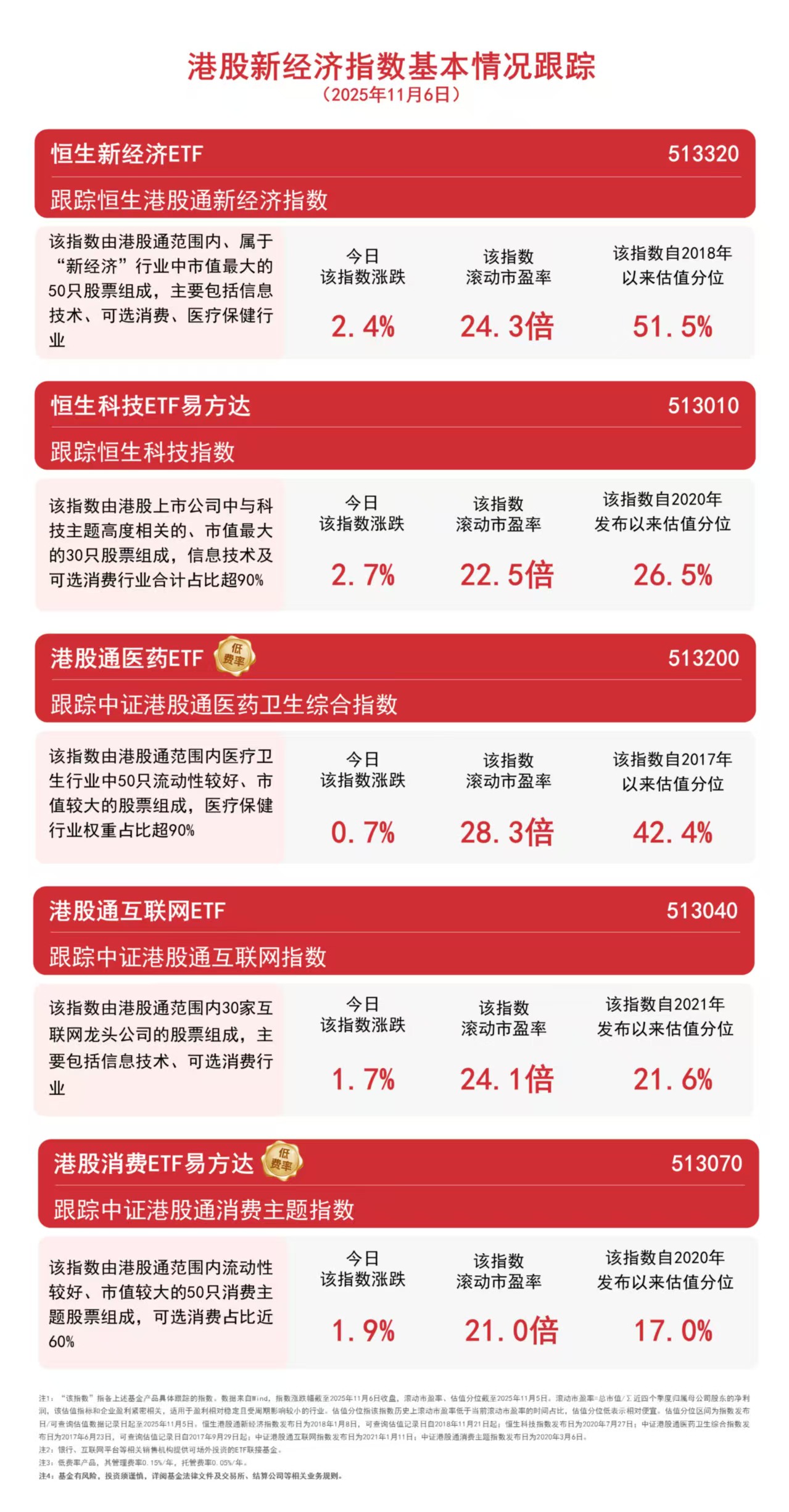 今日港股板塊集體大漲,半導(dǎo)體和互聯(lián)網(wǎng)龍頭漲幅居前,醫(yī)藥板塊尾盤發(fā)力。截至收盤,恒生科技指數(shù)上漲2.7%,恒生港股通新經(jīng)濟(jì)指數(shù)上漲2.4%,中證港股通消費(fèi)主題指數(shù)上漲1.9%,中證港股通互聯(lián)網(wǎng)指數(shù)上漲1.7%,中證港股通醫(yī)藥衛(wèi)生綜合指數(shù)上漲0.7%。Wind數(shù)據(jù)顯示,截至昨日,恒生科技ETF易方達(dá)(513010)、港股通互聯(lián)網(wǎng)ETF(513040)均連續(xù)5個交易日獲凈流入,分別合計約10億元和3億元。