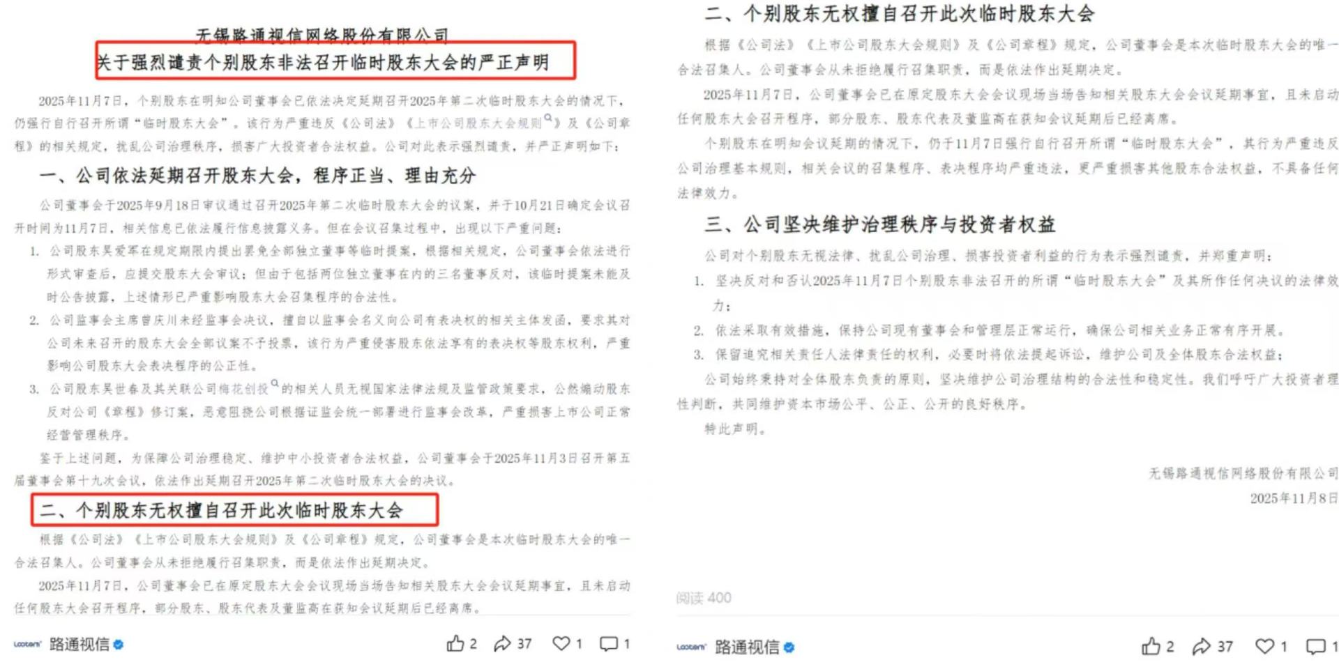 不過(guò),路通視信官方微信公眾號(hào)在11月9日凌晨發(fā)文,稱個(gè)別股東“強(qiáng)行自行召開所謂臨時(shí)股東大會(huì)”程序違法、損害股東權(quán)益,相關(guān)決議不具備法律效力。