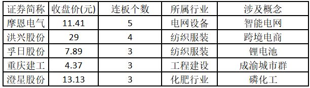 從連板情況來看,今日首板個股有60只;2連板的個股有5只;3連板及以上的個股有6只。今日連板數(shù)排名前5的個股包括摩恩電氣、洪興股份、孚日股份、重慶建工、澄星股份,具體如下表所示。