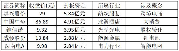 從封板資金來看,今日漲停板個股中,封板資金排名前5的個股包括洪興股份、中國中免、維信諾、威領股份、深南電A。歡迎大家關注微信公眾號“道達號”,其“道達漲停復盤”欄目為大家解讀。