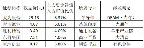 主力資金凈流入金額占市值比例排名前5的個股分別為大為股份、青山紙業(yè)、勝利精密、東百集團、寶地礦業(yè)。