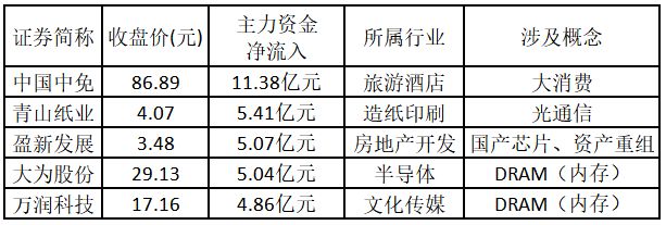 從主力資金來看,今日漲停板個股中,主力資金凈流入金額排名前5的個股分別為中國中免、青山紙業(yè)、盈新發(fā)展、大為股份、萬潤科技。