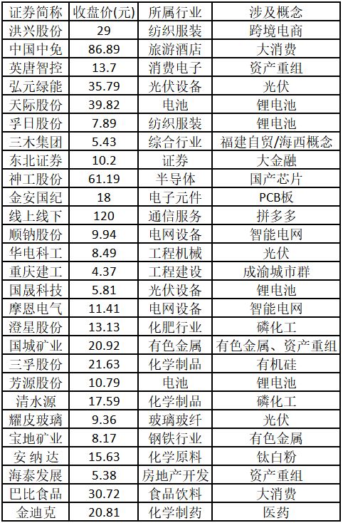 漲停板個股中,股價創(chuàng)出近一年新高的個股有27只(不包括創(chuàng)出歷史新高的個股),包括洪興股份、中國中免、英唐智控、弘元綠能、天際股份、孚日股份、三木集團、東北證券、神工股份、金安國紀、線上線下、順鈉股份、華電科工、重慶建工、國晟科技、摩恩電氣、澄星股份、國城礦業(yè)、三孚股份、芳源股份、清水源、耀皮玻璃、寶地礦業(yè)、安納達、海泰發(fā)展、巴比食品、金迪克,具體如下表所示。