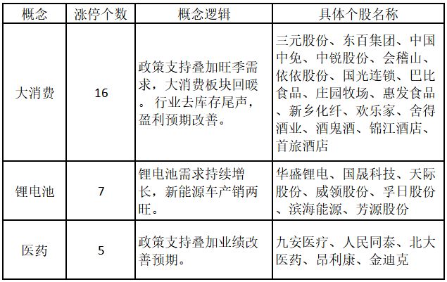 從概念特征來看,今日漲停板個股中,大消費、鋰電池、醫(yī)藥概念的個股最多。