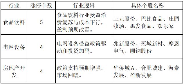 從行業(yè)特征來看,今日漲停板個股中,食品飲料、電網(wǎng)設備、房地產(chǎn)開發(fā)行業(yè)的個股最多。