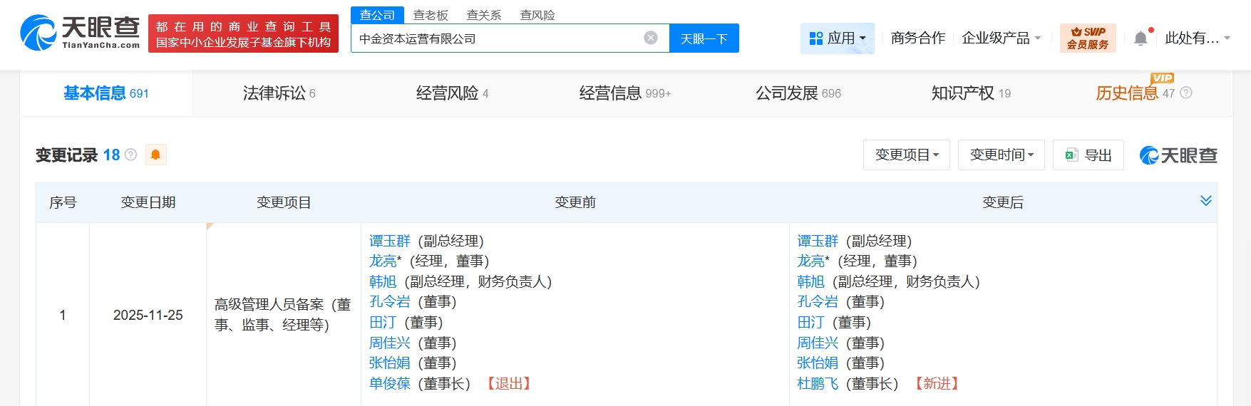 每經(jīng)AI快訊,天眼查工商信息顯示,近日,中金資本運(yùn)營(yíng)有限公司發(fā)生工商變更,單俊葆卸任董事長(zhǎng),由杜鵬飛接任。該公司成立于2017年3月,法定代表人為龍亮,注冊(cè)資本20億元人民幣,經(jīng)營(yíng)范圍為資產(chǎn)管理、投資管理、項(xiàng)目投資、投資咨詢,由中金公司(601995)全資持股。
