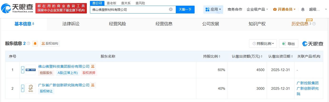 每經(jīng)AI快訊,天眼查App顯示,近日,佛山佛塑新材料有限公司成立,法定代表人為何婉慧,注冊(cè)資本7500萬元人民幣,經(jīng)營(yíng)范圍包括塑料制品制造、塑料制品銷售、新材料技術(shù)研發(fā)、電子專用材料研發(fā)等。股東信息顯示,該公司由佛塑科技(000973)、廣東省廣新創(chuàng)新研究院有限公司共同持股。