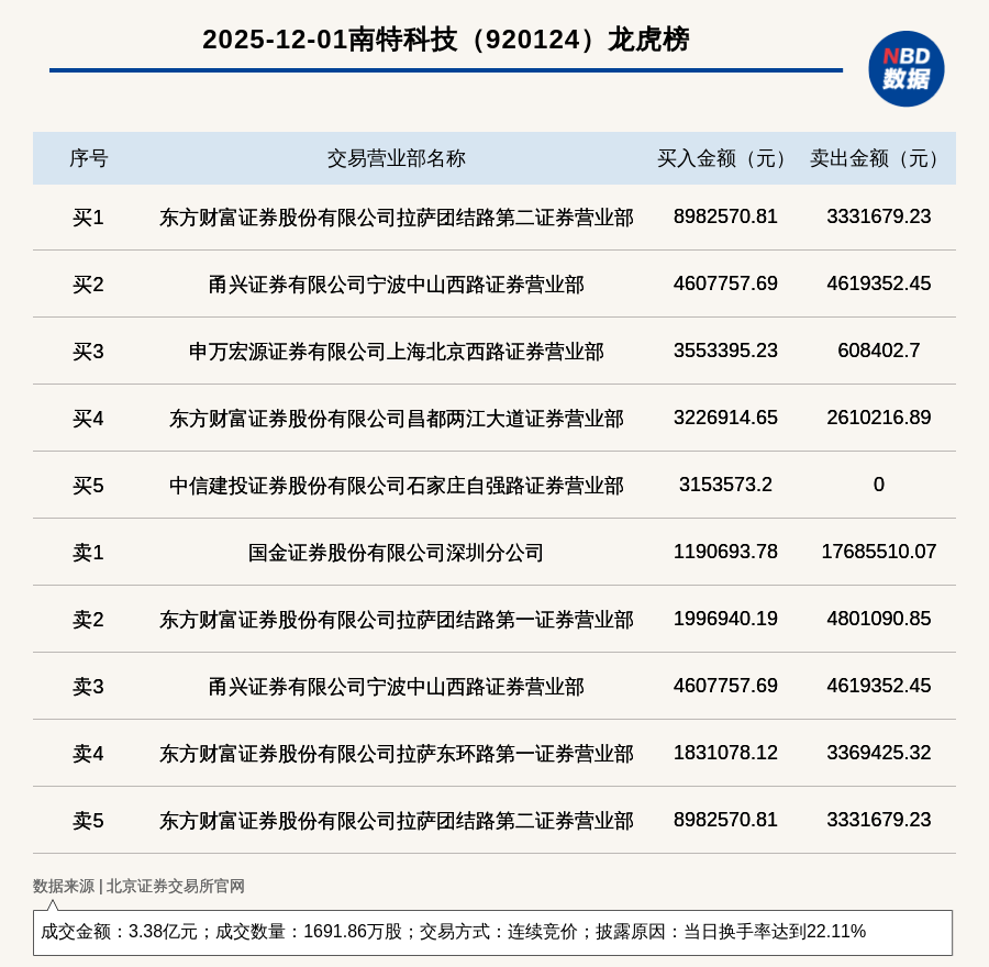 每經(jīng)訊,2025年12月1日,北交所上市公司南特科技(920124,收盤價(jià):19.88元)登上龍虎榜,交易方式是連續(xù)競價(jià),披露原因是當(dāng)日換手率達(dá)到22.11%,成交數(shù)量1691.86萬股,成交金額3.38億元。買一席位為東方財(cái)富證券股份有限公司拉薩團(tuán)結(jié)路第二證券營業(yè)部,買入898.26萬元;賣一席位為國金證券股份有限公司深圳分公司,賣出1768.55萬元。