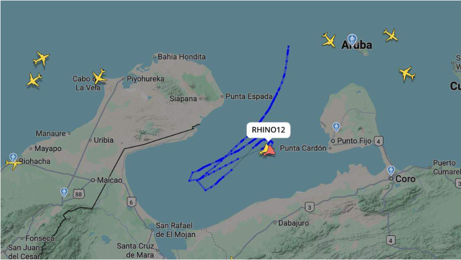 FlightRadar24等網(wǎng)站顯示,美國戰(zhàn)斗機留下的飛行軌跡表明,它們在委西北部的馬拉開波湖北部上空飛行,飛越委內(nèi)瑞拉灣水域,飛行路線位于委內(nèi)瑞拉兩個能源產(chǎn)業(yè)關(guān)鍵地區(qū)——蘇利亞州的拉瓜希拉市和法爾孔州首府科羅市之間。