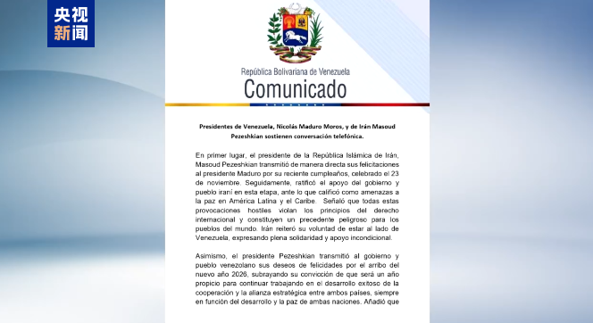 12月9日,委內(nèi)瑞拉外交部長希爾在社交媒體上發(fā)布政府公告稱,委內(nèi)瑞拉總統(tǒng)馬杜羅與伊朗總統(tǒng)佩澤希齊揚進行了電話會談。