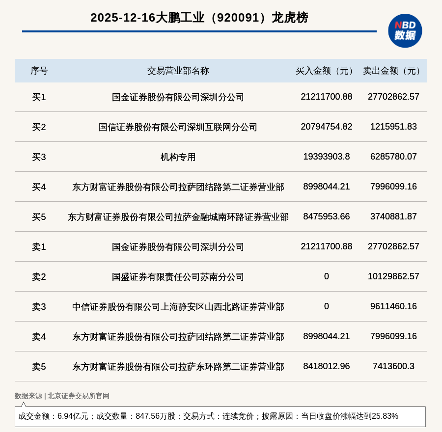 每經(jīng)訊,2025年12月16日,北交所上市公司大鵬工業(yè)(920091,收盤價:93.43元)登上龍虎榜,交易方式是連續(xù)競價,披露原因是當日收盤價漲幅達到25.83%,成交數(shù)量847.56萬股,成交金額6.94億元。買一席位為國金證券股份有限公司深圳分公司,買入2121.17萬元;賣一席位為國金證券股份有限公司深圳分公司,賣出2770.29萬元。