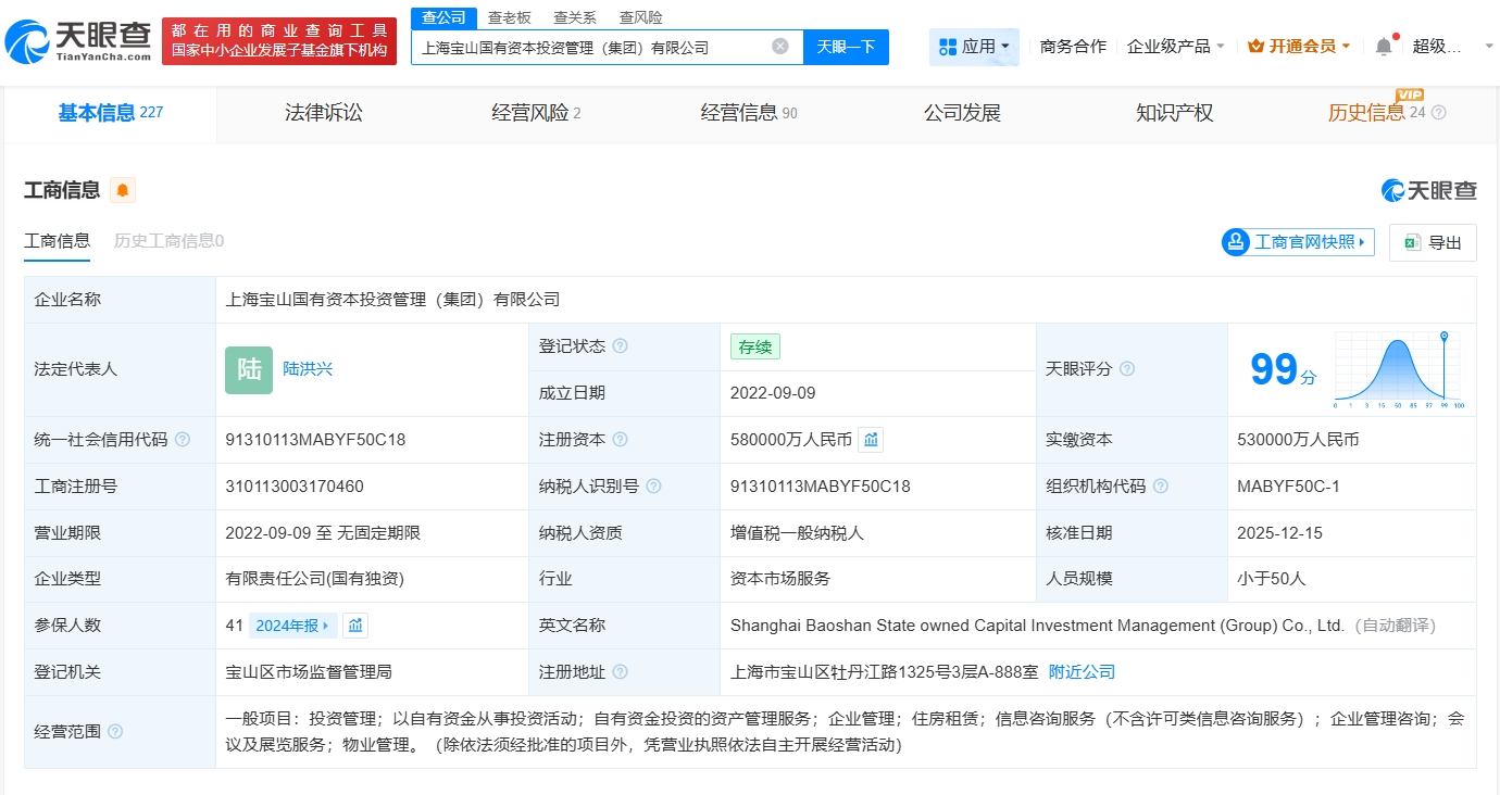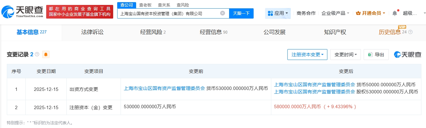 每經(jīng)AI快訊,天眼查App顯示,近日,上海寶山國(guó)有資本投資管理(集團(tuán))有限公司發(fā)生工商變更,注冊(cè)資本由53億元人民幣增至58億元人民幣,增幅約9.43%。該公司成立于2022年9月,法定代表人為陸洪興,經(jīng)營(yíng)范圍包括投資管理、以自有資金從事投資活動(dòng)、自有資金投資的資產(chǎn)管理服務(wù)、企業(yè)管理等。股東信息顯示,該公司由上海市寶山區(qū)國(guó)有資產(chǎn)監(jiān)督管理委員會(huì)(上海市寶山區(qū)集體資產(chǎn)監(jiān)督管理委員會(huì))全資持股。