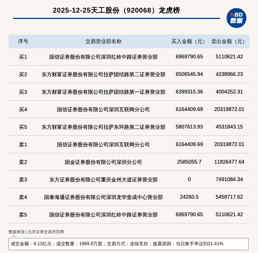 每經(jīng)訊,2025年12月25日,北交所上市公司天工股份(920068,收盤價:21.08元)登上龍虎榜,交易方式是連續(xù)競價,披露原因是當(dāng)日換手率達(dá)到31.41%,成交數(shù)量1969.8萬股,成交金額4.13億元。買一席位為國信證券股份有限公司深圳紅嶺中路證券營業(yè)部,買入696.98萬元;賣一席位為國信證券股份有限公司深圳互聯(lián)網(wǎng)分公司,賣出2031.99萬元。