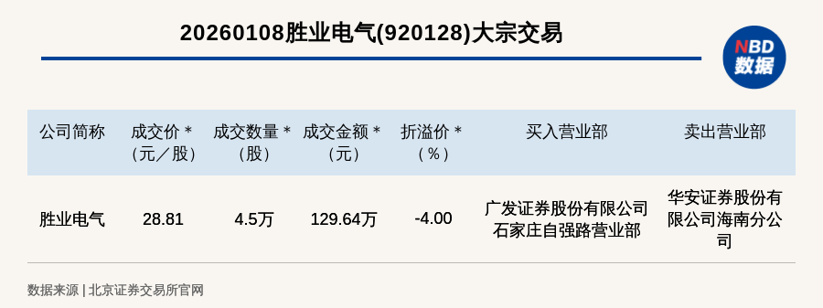每經(jīng)訊,2026年1月8日,北交所上市公司勝業(yè)電氣(920128,收盤價(jià):30.01元)發(fā)生一筆大宗交易,成交價(jià)28.81元/股,成交數(shù)量4.5萬股,成交金額129.64萬元,折價(jià)4%。買入營業(yè)部是廣發(fā)證券股份有限公司石家莊自強(qiáng)路營業(yè)部,賣出營業(yè)部是華安證券股份有限公司海南分公司。