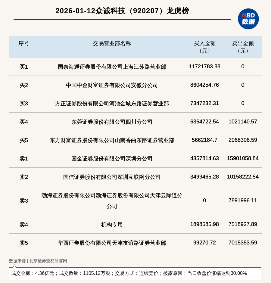 每經(jīng)訊,2026年1月12日,北交所上市公司眾誠科技(920207,收盤價:41.6元)登上龍虎榜,交易方式是連續(xù)競價,披露原因是當日收盤價漲幅達到30.00%,成交數(shù)量1105.12萬股,成交金額4.36億元。買一席位為國泰海通證券股份有限公司上海江蘇路營業(yè)部,買入1172.18萬元;賣一席位為國金證券股份有限公司深圳分公司,賣出1590.11萬元。
