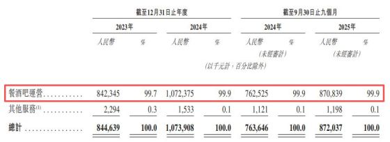 招股書顯示,極物思維的收入單一,公司幾乎所有收入均來自餐酒吧運營。2023年、2024年和2025年前三季度(下稱“報告期內”),餐酒吧運營占其收入的比例分別為99.7%、99.9%和99.9%。