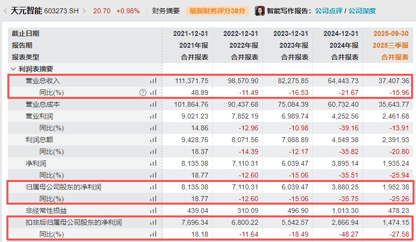 每經(jīng)記者注意到,天元智能過去數(shù)年來業(yè)績波動較大。2022年—2024年,公司營收、歸母凈利潤和扣非凈利潤已經(jīng)連續(xù)三年出現(xiàn)下滑。2025年前三季度,公司營收和歸母凈利潤分別同比下滑15.96%和25.26%。