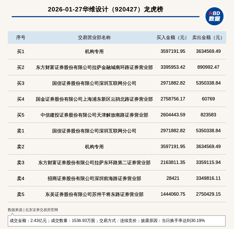 每經(jīng)訊,2026年1月27日,北交所上市公司華維設(shè)計(920427,收盤價:16.48元)登上龍虎榜,交易方式是連續(xù)競價,披露原因是當日換手率達到30.19%,成交數(shù)量1536.93萬股,成交金額2.43億元。買一席位為機構(gòu)專用,買入359.72萬元;賣一席位為國信證券股份有限公司深圳互聯(lián)網(wǎng)分公司,賣出535.03萬元。