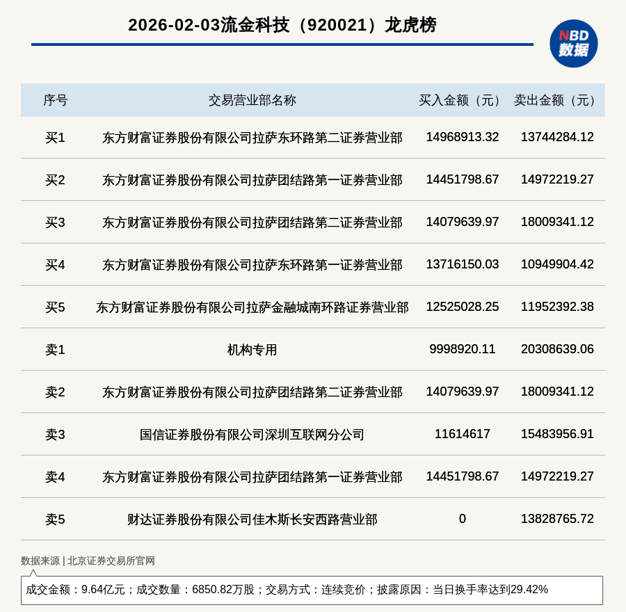 每經訊,2026年2月3日,北交所上市公司流金科技(920021,收盤價:13.86元)登上龍虎榜,交易方式是連續(xù)競價,披露原因是當日換手率達到29.42%,成交數量6850.82萬股,成交金額9.64億元。買一席位為東方財富證券股份有限公司拉薩東環(huán)路第二證券營業(yè)部,買入1496.89萬元;賣一席位為機構專用,賣出2030.86萬元。