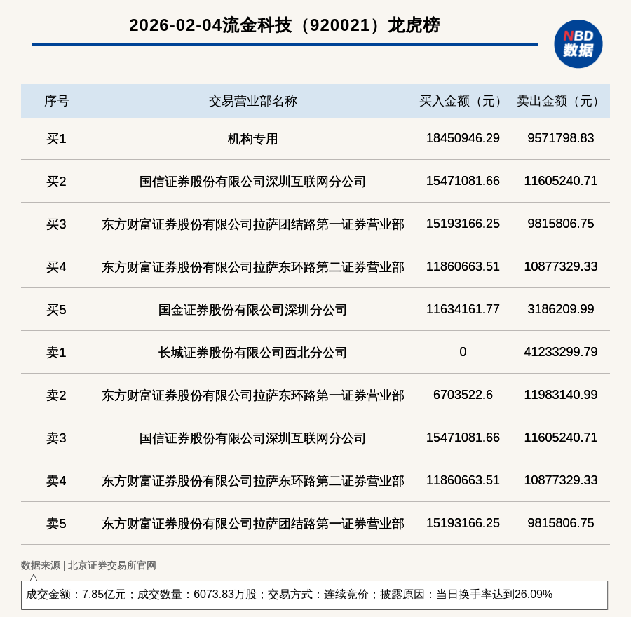每經(jīng)訊,2026年2月4日,北交所上市公司流金科技(920021,收盤價(jià):13.06元)登上龍虎榜,交易方式是連續(xù)競(jìng)價(jià),披露原因是當(dāng)日換手率達(dá)到26.09%,成交數(shù)量6073.83萬股,成交金額7.85億元。買一席位為機(jī)構(gòu)專用,買入1845.09萬元;賣一席位為長城證券股份有限公司西北分公司,賣出4123.33萬元。