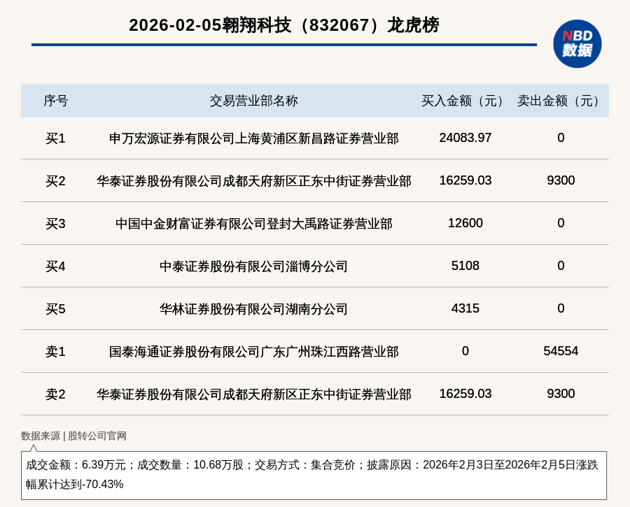 每經(jīng)訊,2026年2月5日,新三板基礎(chǔ)層公司翱翔科技(832067,收盤價:0.55元)登上龍虎榜,交易方式是集合競價,披露原因是2026年2月3日至2026年2月5日漲跌幅累計達到-70.43%,成交數(shù)量10.68萬股,成交金額6.39萬元。買一席位為申萬宏源證券有限公司上海黃浦區(qū)新昌路證券營業(yè)部,買入2.41萬元;賣一席位為國泰海通證券股份有限公司廣東廣州珠江西路營業(yè)部,賣出5.46萬元。