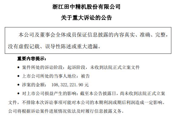 除異動公告外,今日晚間,田中精機(jī)還在另一份單獨(dú)的公告中披露了公司所涉及的重大訴訟。