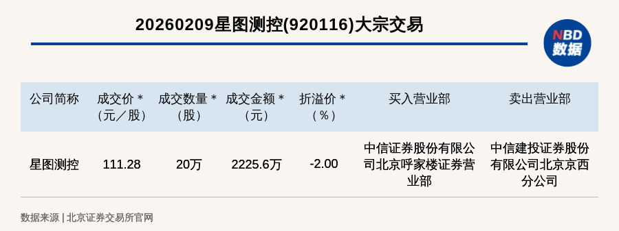 每經(jīng)訊,2026年2月9日,北交所上市公司星圖測(cè)控(920116,收盤(pán)價(jià):113.55元)發(fā)生一筆大宗交易,成交價(jià)111.28元/股,成交數(shù)量20萬(wàn)股,成交金額2225.6萬(wàn)元,折價(jià)2%。買(mǎi)入營(yíng)業(yè)部是中信證券股份有限公司北京呼家樓證券營(yíng)業(yè)部,賣(mài)出營(yíng)業(yè)部是中信建投證券股份有限公司北京京西分公司。