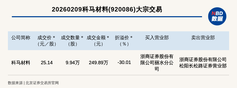 每經(jīng)訊,2026年2月9日,北交所上市公司科馬材料(920086,收盤(pán)價(jià):35.92元)發(fā)生一筆大宗交易,成交價(jià)25.14元/股,成交數(shù)量9.94萬(wàn)股,成交金額249.89萬(wàn)元,折價(jià)30.01%。買入營(yíng)業(yè)部是浙商證券股份有限公司麗水分公司,賣出營(yíng)業(yè)部是浙商證券股份有限公司松陽(yáng)長(zhǎng)松路證券營(yíng)業(yè)部。