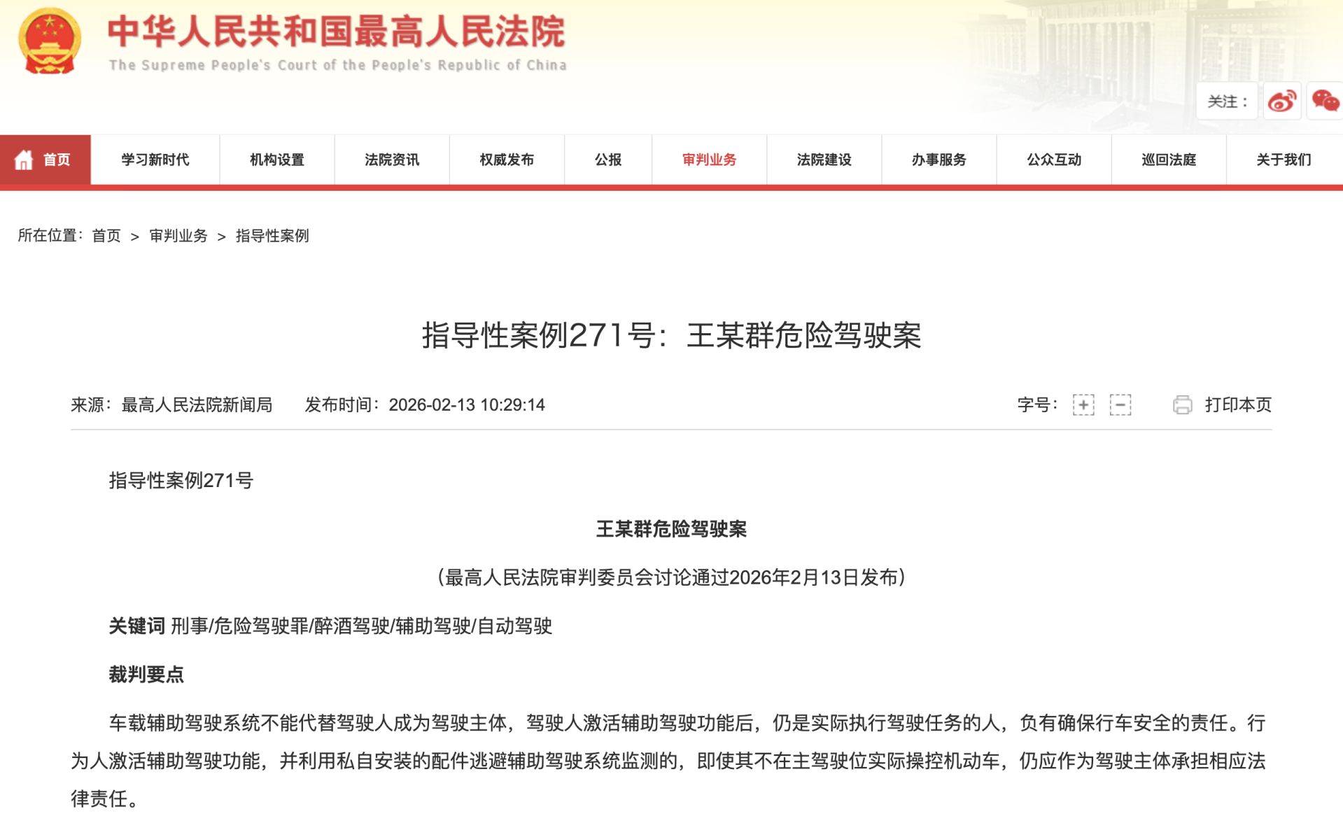 2月13日,最高人民法院發(fā)布第48批指導性案例(268–272號),這是最高法首次發(fā)布道路交通安全刑事專題指導性案例。