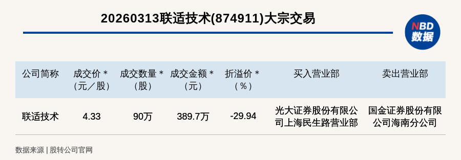 每經(jīng)訊,2026年3月13日,新三板基礎(chǔ)層公司聯(lián)適技術(shù)(874911,收盤價:6.18元)發(fā)生一筆大宗交易,成交價4.33元/股,成交數(shù)量90萬股,成交金額389.7萬元,折價29.94%。買入營業(yè)部是光大證券股份有限公司上海民生路營業(yè)部,賣出營業(yè)部是國金證券股份有限公司海南分公司。