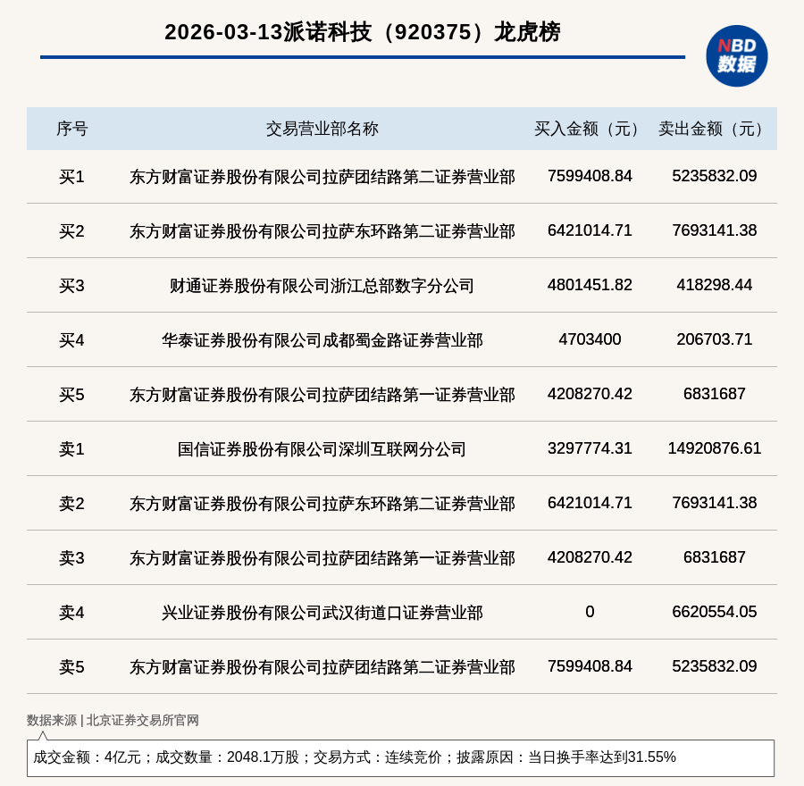 每經(jīng)訊,2026年3月13日,北交所上市公司派諾科技(920375,收盤價(jià):18.09元)登上龍虎榜,交易方式是連續(xù)競(jìng)價(jià),披露原因是當(dāng)日換手率達(dá)到31.55%,成交數(shù)量2048.1萬股,成交金額4億元。買一席位為東方財(cái)富證券股份有限公司拉薩團(tuán)結(jié)路第二證券營(yíng)業(yè)部,買入759.94萬元;賣一席位為國(guó)信證券股份有限公司深圳互聯(lián)網(wǎng)分公司,賣出1492.09萬元。