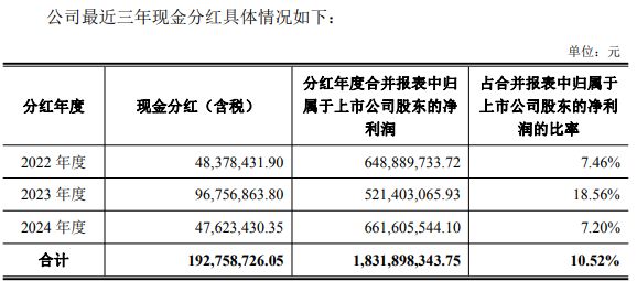然而,《每日經(jīng)濟(jì)新聞》記者(下稱“每經(jīng)記者”)注意到,公司2022年、2023年和2024年的現(xiàn)金分紅分別為4837.84萬元、9675.69萬元和4762.34萬元。最近三年累計(jì)現(xiàn)金分紅僅約1.93億元,占三年歸母凈利潤(18.32億元)的比例僅為10.52%。對比此次一口氣拋出不超過60億元的巨額定增,其融資必要性與分紅比例的反差或引市場關(guān)注。