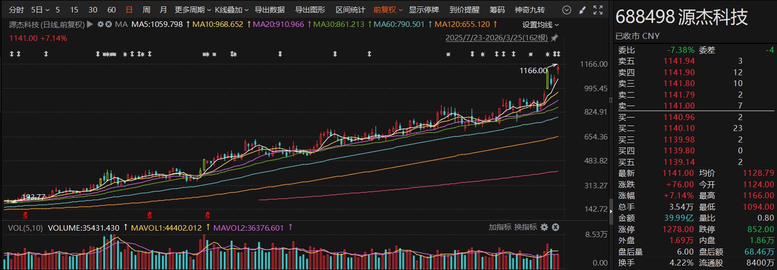 3月20日早間,源杰科技一度上漲20%,股價最高達1140元/股。但截至當天收盤,源杰科技回撤至1114.99元/股,收漲17.37%。