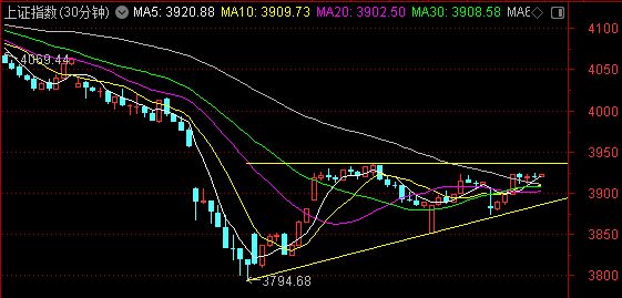就30分鐘K線圖來(lái)看,上證指數(shù)最近的5根K線出現(xiàn)“單陽(yáng)+橫盤(pán)”的形態(tài),指數(shù)點(diǎn)位在多根短期均線之上,且這些短期均線交織,這意味著變盤(pán)一觸即發(fā)。