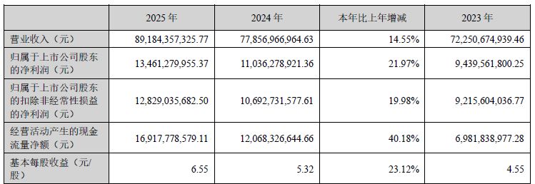 陽(yáng)光電源(SZ300274,股價(jià)150.76元,市值3126億元)3月31日盤后發(fā)布2025年年報(bào),公司2025年實(shí)現(xiàn)營(yíng)收約891.84億元,同比增長(zhǎng)14.55%;實(shí)現(xiàn)歸屬于上市公司股東的凈利潤(rùn)約134.61億元,同比增長(zhǎng)21.97%;實(shí)現(xiàn)扣非凈利潤(rùn)約128.29億元,同比增長(zhǎng)19.98%;基本每股收益6.55元,同比增長(zhǎng)23.12%。公司擬以剔除回購(gòu)專用證券賬戶中已回購(gòu)股份后的股本為基數(shù),向全體股東每10股派發(fā)現(xiàn)金紅利6.9元(含稅)。