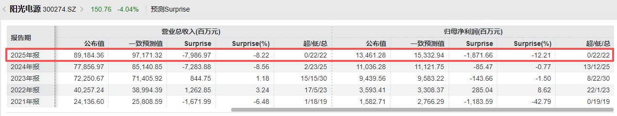 據(jù)萬(wàn)得金融終端匯編的數(shù)據(jù),22家機(jī)構(gòu)對(duì)陽(yáng)光電源2025年的營(yíng)收和歸母凈利潤(rùn)的一致預(yù)測(cè)值分別約為971.71億元和153.33億元。因此,從陽(yáng)光電源披露的業(yè)績(jī)來(lái)看,雙雙不及分析師一致預(yù)期,公司營(yíng)收和歸母凈利潤(rùn)的公布值分別較機(jī)構(gòu)一致預(yù)期低了8.22%和12.21%,且營(yíng)收和歸母凈利潤(rùn)低于所有22家機(jī)構(gòu)的預(yù)測(cè)值。