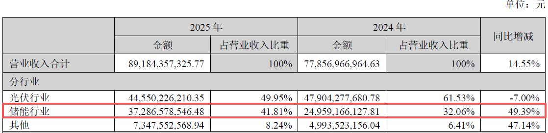 《每日經(jīng)濟(jì)新聞》記者(下稱“每經(jīng)記者”)注意到,陽(yáng)光電源儲(chǔ)能系統(tǒng)業(yè)務(wù)在2025年表現(xiàn)搶眼,該業(yè)務(wù)期內(nèi)實(shí)現(xiàn)營(yíng)收約372.87億元,同比增長(zhǎng)49.39%,占總營(yíng)收的比重從2024年的32.06%提升至41.81%。全年儲(chǔ)能系統(tǒng)全球發(fā)貨量達(dá)到43GWh。