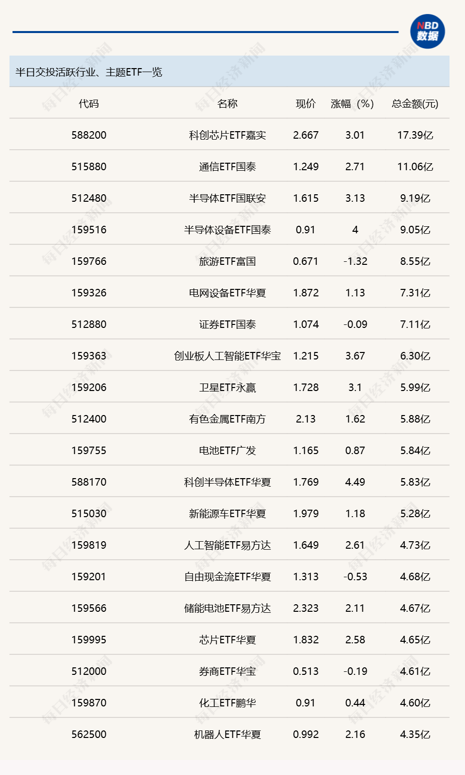 今日上午,行業(yè)主題ETF交投活躍度不高,僅科創(chuàng)芯片ETF嘉實(shí)(588200)和通信ETF國泰(515880)半日成交金額超過10億元;跨境ETF方面,香港證券ETF易方達(dá)(513090)半日成交金額為32.43億元。