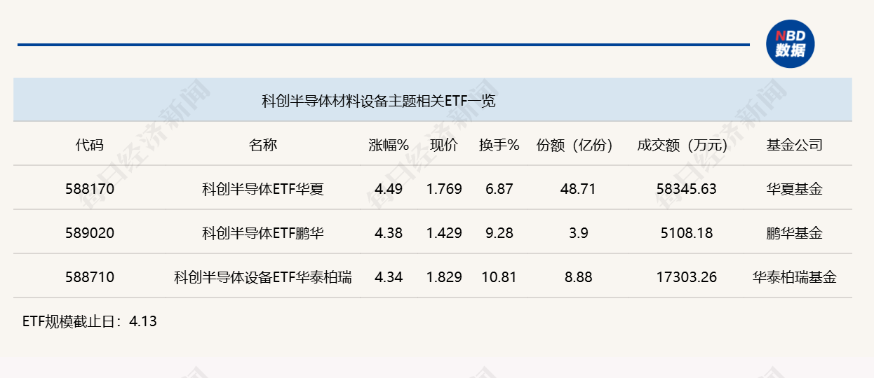 點(diǎn)評:科創(chuàng)半導(dǎo)體ETF華夏(588170)、科創(chuàng)半導(dǎo)體ETF鵬華(589020)以及科創(chuàng)半導(dǎo)體設(shè)備ETF華泰柏瑞(588710)今日上午漲幅均超過4%,其中,科創(chuàng)半導(dǎo)體ETF華夏(588170)份額較大,達(dá)到48.71億份,其半日成交金額為5.83億元。上述三只ETF均追蹤的是上證科創(chuàng)板半導(dǎo)體材料設(shè)備主題指數(shù)。