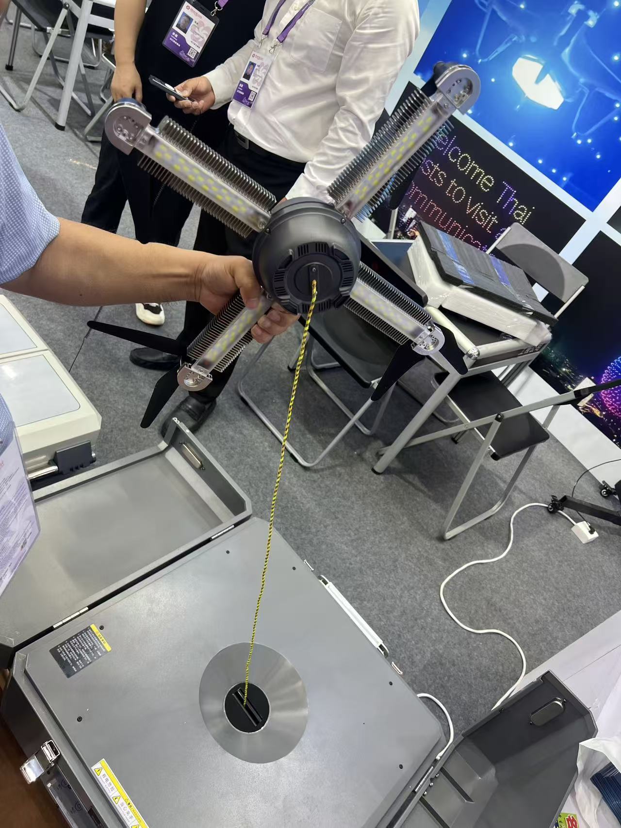 記者現(xiàn)場(chǎng)看到,其展會(huì)上擺放著大大小小多款照明無(wú)人機(jī)。其中,小的一款機(jī)身大小和普通拍照無(wú)人機(jī)無(wú)異,卻能照亮3000平方米;大的一款功率高達(dá)2400瓦,照明面積可達(dá)2.5萬(wàn)平方米。