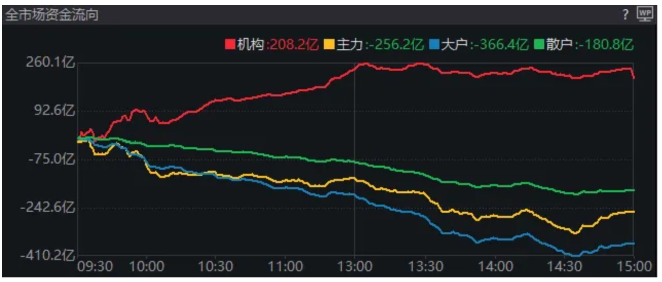 Wind數(shù)據(jù)顯示,從資金流向來看,全天僅有機(jī)構(gòu)資金(定義為掛單額大于100萬(wàn)元)還在持續(xù)流入,而主力、大戶、散戶資金均持續(xù)流出。