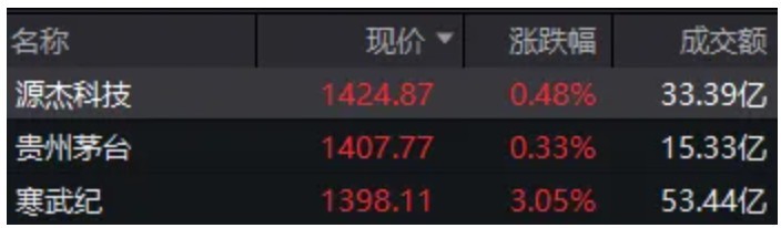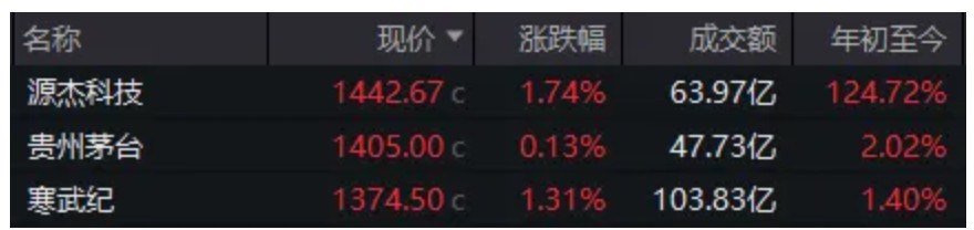 早間,源杰科技、貴州茅臺(tái)、寒武紀(jì)三只千元股的股價(jià)一度相當(dāng)接近。