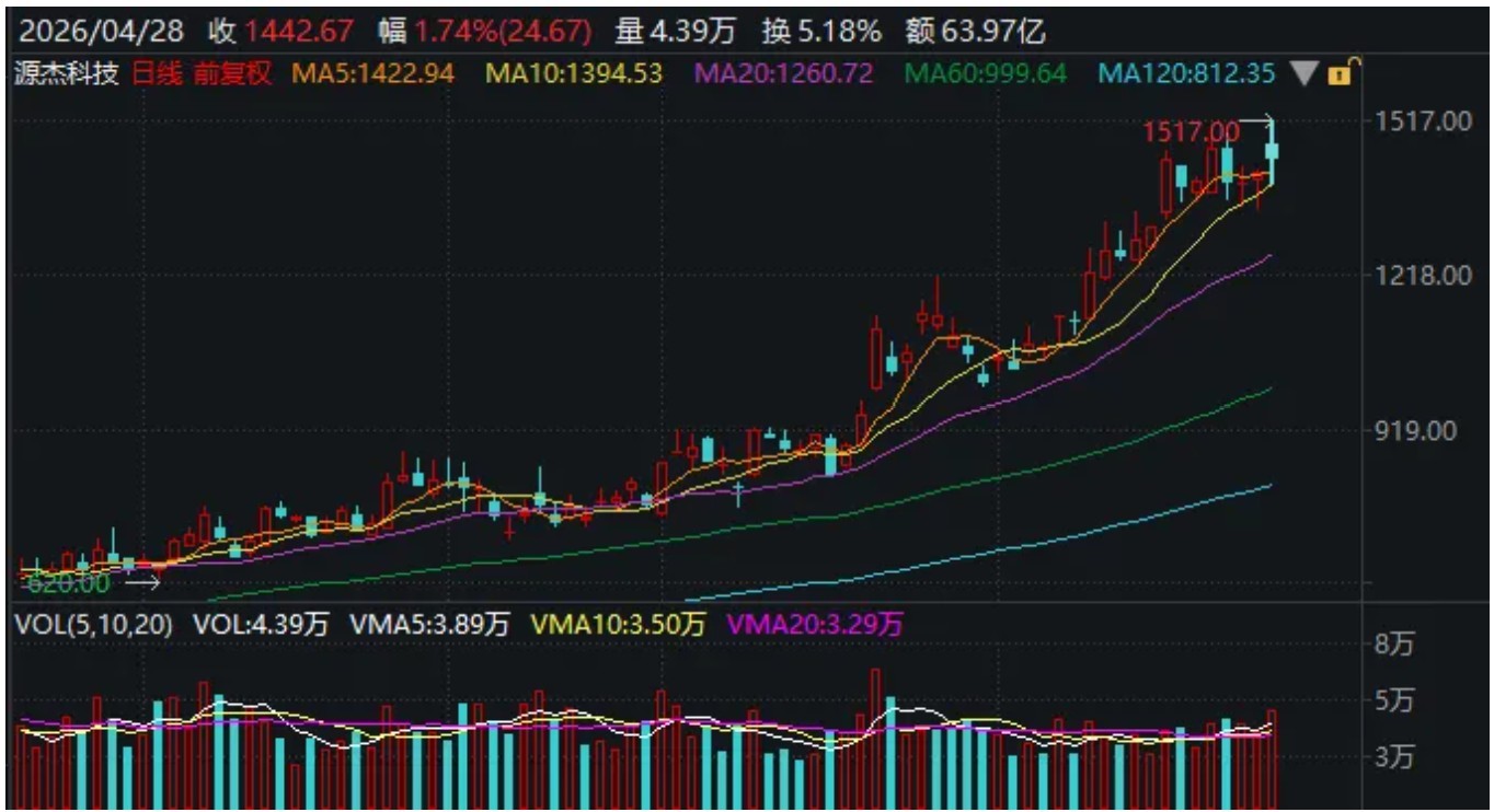 早盤,源杰科技憑借超預(yù)期的一季報(bào)高開高走,盤中股價(jià)一度突破1500元,穩(wěn)居A股第一高價(jià)股;