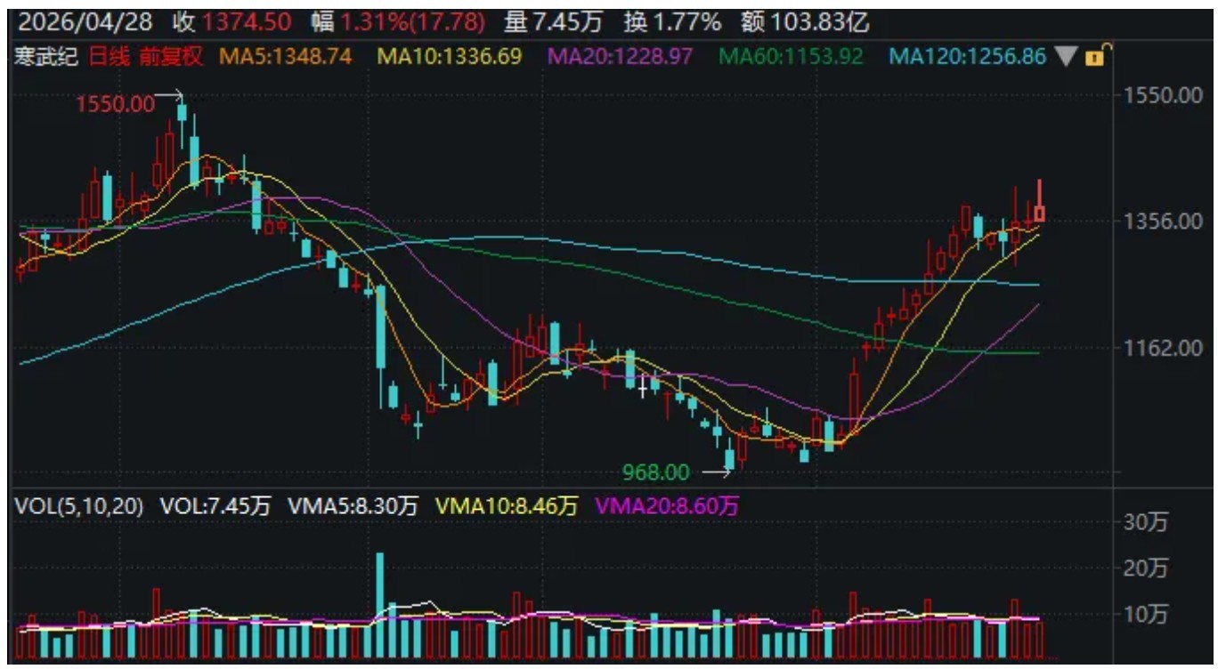 寒武紀(jì)今年以來總體走出V字反轉(zhuǎn),目前仍是上升趨勢(shì),但距前期高點(diǎn)還有一些空間。
