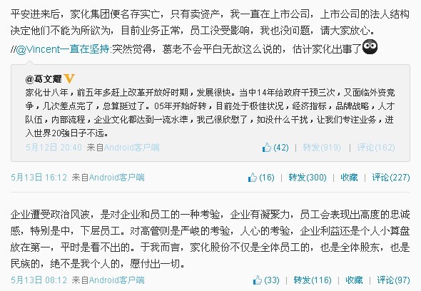 昨日下午,葛文耀發(fā)的另一條微博中,將矛頭直指大股東平安集團(tuán):“平安進(jìn)來(lái)后,家化集團(tuán)便名存實(shí)亡,只有賣(mài)資產(chǎn),我一直在上市公司,上市公司的法人結(jié)構(gòu)決定他們不能為所欲為……”