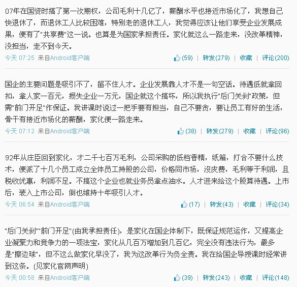 “企業(yè)退休職工工資低是中國(guó)社保制度一大問(wèn)題。2007年家化經(jīng)濟(jì)效益開(kāi)始明顯好轉(zhuǎn),我便開(kāi)始解決退休職工的‘共享費(fèi)’(讓退休員工也享受企業(yè)發(fā)展成果,每月發(fā)幾百元生活補(bǔ)貼)。”5月9日凌晨,葛文耀曾在其個(gè)人微博中描述“共享費(fèi)”,對(duì)其首次進(jìn)行公開(kāi)。【更多】